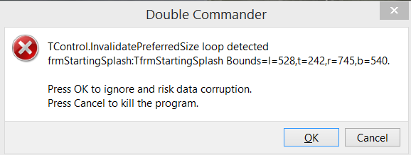 | Description | While still using version 0.6.2 , all of a sudden I started getting the following error TControl.InvalidatePreferredSize loop detected frmStartingSplash:TfrmStartingSplash Bounds=l=528;t=242;r=745;b=540 I still get the same error even after installing the newer version - 0.6.3 Program wouldn't even start. I tried: 1. Uninstalling version 0.6.2 2. Installing version 0.6.3 3. Uninstalling version 0.6.3 and trying to portable 0.6.3 version. 4. Rebooting my machine and re-installing 0.6.3. Error persists, can not start application. | ||||