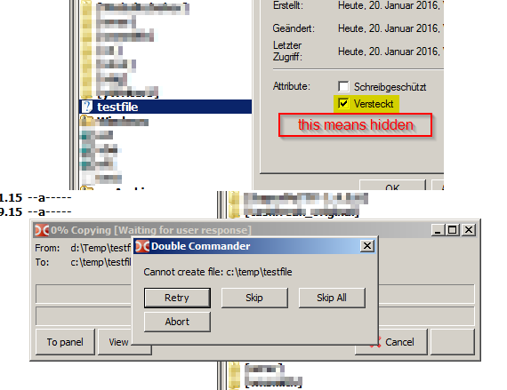 | Steps To Reproduce | Create a file, set the attribute to hidden and copy it to any destination (drag drop). Copy it again and try to overwrite it. It does not work. |