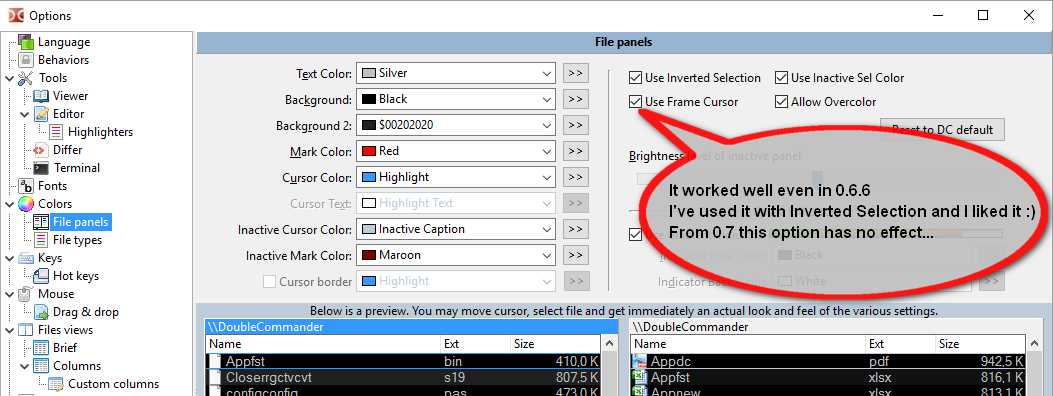 | Description | In Options/Colors/File panels there's the option Frame Cursor, which no longer works from version 0.7. It workes well even in 0.6.6. I've used it with Inverted Selection and I liked it :) See attached picture for faster understanding. | ||||
