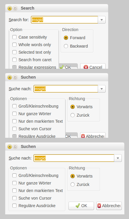 | Description | in the built in Editor the initial Search Dialog Size is to small to fit widgets and text (text tested english and german), see attached screenshots. Also the "Cancel"-Button should be a little wider to fit the german word "Abbrechen" in it. In this dialog the OK-Button is on the left side, the Cancel-Button is on the right side. The button order in other dialogs is not always the same order. E. g. the file delete dialog has the OK-Button on the right side. OK- and Cancel-Buttons should be ordered the same in all dialogs. | ||||