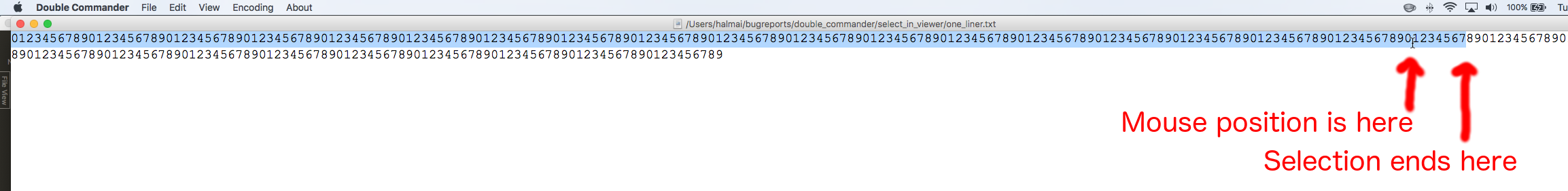 | Description | I open a txt file with 0000241:0000300 characters in a line. - I select the very first characters of the line. It works fine. - I select characters from 20th position. It selects not from not the character under the mouse but from the next one - I select characters from the 40th position. It selects not from the character under the mouse cursor but from 2 characters after it. - I select characters from the 100th position. It selects from 104th character. It seems that the conversion from the horizontal mouse position (measured in pixels) to character position is wrong. The attached screenshot shows the following: - I started to select the text by pressing the mouse right before the first character of the row - I kept the mouse button pressed while I moved right - During moving right, the difference between the right edge of the blue selection area and the mouse position was continuously growing and it was proportional to the X position. - When I move back to left, the gap is decreasing again. (The same bug was present with the ~6 months old version as well, I was just waiting for the new version before I reported it.) | ||||