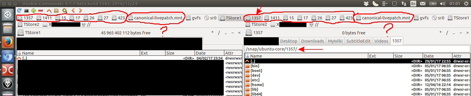 | Description | Double Commander shows multiple drives with a numbers only label corresponding to installed sanps. The paths to the drive letters are of type: /snap/hello-world/27/ -> doublecmd shows drive with label 27 /snap/ubuntu-core/1357/ -> doublecmd shows drive with label 1357 Please add option for doublecmd to ignore numbers only drive letters or simply not include snap "drives" in Ubuntu. | ||||
