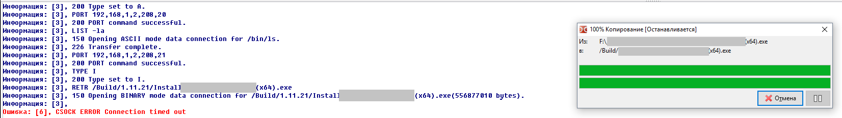 | Description | This error happens every time when file download takes a lot of time (huge file about 500M). File download seems to be finished the file is downloaded but the file copy window stays active with 100% state and has message "[Waiting for user input]" in title. Operations log panel shows message: [6], CSOCK ERROR Connection timed out There are additional error message dialog window hidden that can be shown only from windows Task Manager with message "Error: Copy file .... -> .... - Error reading from file". | ||||