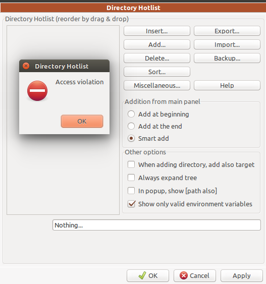 | Description | Using Enter to change the Path of an entry in the Directory Hotlist makes DC hang with a message "Access violation". (Had to force close DC.) (See screenshot) Note: Clicking "Ok" or "Apply" works fine | ||||