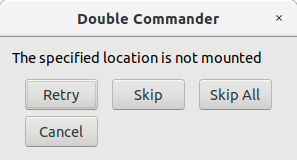 | Description | I was copying several gigabytes of files from an sftp:// location, and around 25%, DC started giving this unspecific error. Which location was not mounted? Was it really not mounted? I clicked "Skip", and the following several files were copied OK. Then I got the error again. The process repeated about 7 times, then copying resumed without incident (for now, it's still in progress). | ||||