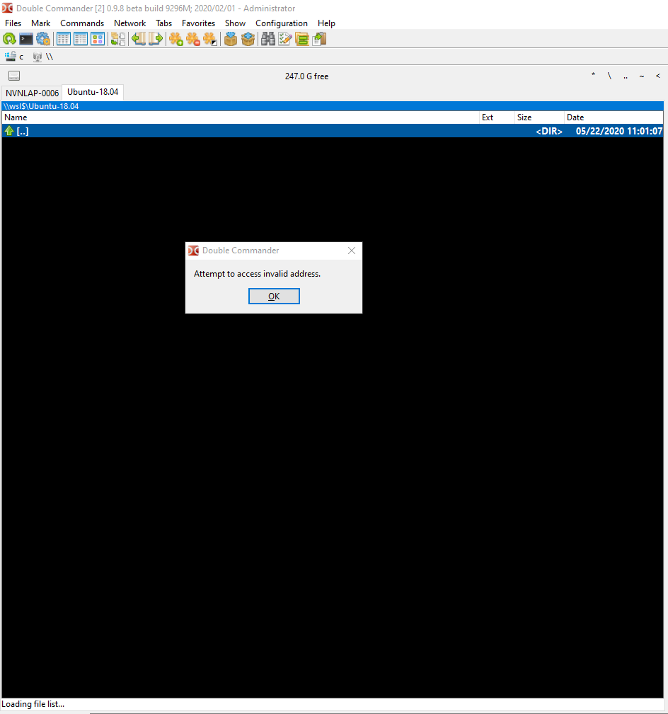 | Description | I have WSL2 ubuntu installed in the machine and can access its directory through path \\wsl$\Ubuntu-18.04\ but when accessing by Double commander, I got this error "Attempt to access invalid address". It occurs in both normal and run as admin mode. | ||||