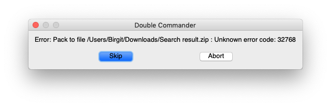 | Description | Search result in listbox can't be packed. Error: Pack to file /Users/.../Search result.zip: Unknown error code: 32768 | ||||