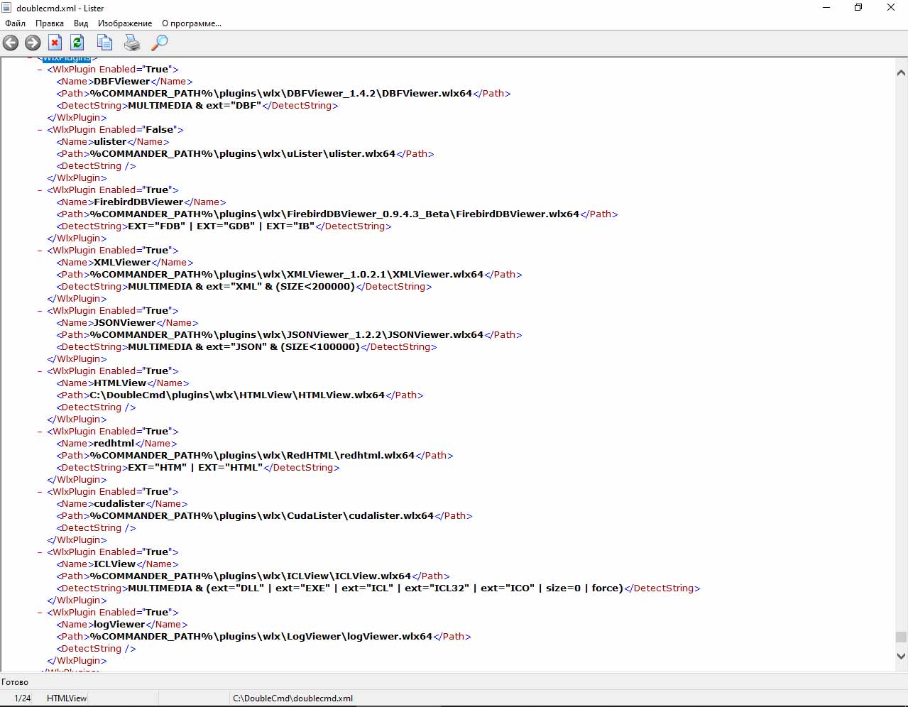 <WlxPlugins> <WlxPlugin Enabled="True"> <Name>DBFViewer</Name> <Path>%COMMANDER_PATH%\plugins\wlx\DBFViewer_1.4.2\DBFViewer.wlx64</Path> <DetectString>MULTIMEDIA & ext="DBF"</DetectString> </WlxPlugin> <WlxPlugin Enabled="False"> <Name>ulister</Name> <Path>%COMMANDER_PATH%\plugins\wlx\uLister\ulister.wlx64</Path> <DetectString/> </WlxPlugin> <WlxPlugin Enabled="True"> <Name>FirebirdDBViewer</Name> <Path>%COMMANDER_PATH%\plugins\wlx\FirebirdDBViewer_0.9.4.3_Beta\FirebirdDBViewer.wlx64</Path> <DetectString>EXT="FDB" | EXT="GDB" | EXT="IB"</DetectString> </WlxPlugin> <WlxPlugin Enabled="True"> <Name>XMLViewer</Name> <Path>%COMMANDER_PATH%\plugins\wlx\XMLViewer_1.0.2.1\XMLViewer.wlx64</Path> <DetectString>MULTIMEDIA & ext="XML" & (SIZE<200000)</DetectString> </WlxPlugin> <WlxPlugin Enabled="True"> <Name>JSONViewer</Name> <Path>%COMMANDER_PATH%\plugins\wlx\JSONViewer_1.2.2\JSONViewer.wlx64</Path> <DetectString>MULTIMEDIA & ext="JSON" & (SIZE<100000)</DetectString> </WlxPlugin> <WlxPlugin Enabled="True"> <Name>HTMLView</Name> <Path>C:\DoubleCmd\plugins\wlx\HTMLView\HTMLView.wlx64</Path> <DetectString/> </WlxPlugin> <WlxPlugin Enabled="True"> <Name>redhtml</Name> <Path>%COMMANDER_PATH%\plugins\wlx\RedHTML\redhtml.wlx64</Path> <DetectString>EXT="HTM" | EXT="HTML"</DetectString> </WlxPlugin> <WlxPlugin Enabled="True"> <Name>cudalister</Name> <Path>%COMMANDER_PATH%\plugins\wlx\CudaLister\cudalister.wlx64</Path> <DetectString/> </WlxPlugin> <WlxPlugin Enabled="True"> <Name>ICLView</Name> <Path>%COMMANDER_PATH%\plugins\wlx\ICLView\ICLView.wlx64</Path> <DetectString>MULTIMEDIA & (ext="DLL" | ext="EXE" | ext="ICL" | ext="ICL32" | ext="ICO" | size=0 | force)</DetectString> </WlxPlugin> <WlxPlugin Enabled="True"> <Name>logViewer</Name> <Path>%COMMANDER_PATH%\plugins\wlx\LogViewer\logViewer.wlx64</Path> <DetectString> </DetectString> </WlxPlugin> |