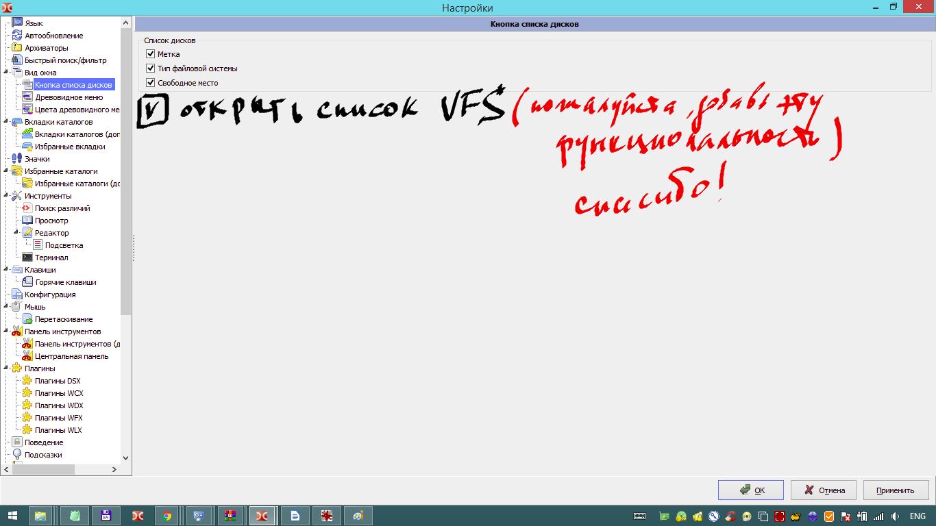 | Additional Information | Feature request. Add set checkbutton "Open list VFS" in button disks for Plugin ADBPlugin.wfx64 Добавление функциональности - "Открыть список VFS" в книпки дисков для ADBPlugin.wfx64 Добрый день! Пожалуйста, добавьте функциональность "Открыть список VFS" галочку(check button) выдранную из Настройки-> Вид окна-> Кнопки дисков в Настройки-> Вид окна-> Кнопка списков дисков-> [V] Открыть список VFS, чтобы на экранах с маленьким разрешением, в том числе и на ноутбуках можно было сэкономить часть экрана отключив не нужную полоску, как компонент основного окна, оставив больше рабочего места. Нужно, например, для задействования модуля c:\doublecmd-1.0.0.r9541.x86_64-win64-qt5.dark\doublecmd\plugins\wfx\androidadb\ADBPlugin.wfx64 без активации не нужной полоски. Смотрите приложенные три скриншота. Благодарю. | ||||