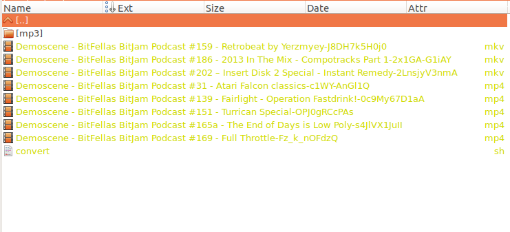 'Demoscene - BitFellas BitJam Podcast #139 - Fairlight - Operation Fastdrink!-0c9My67D1aA.mp4' 'Demoscene - BitFellas BitJam Podcast #151 - Turrican Special-OPJ0gRCcPAs.mp4' 'Demoscene - BitFellas BitJam Podcast #159 - Retrobeat by Yerzmyey-J8DH7k5H0j0.mkv' 'Demoscene - BitFellas BitJam Podcast #165a - The End of Days is Low Poly-s4JlVX1JuII.mp4' 'Demoscene - BitFellas BitJam Podcast #169 - Full Throttle-Fz_k_nOFdzQ.mp4' 'Demoscene - BitFellas BitJam Podcast #186 - 2013 In The Mix - Compotracks Part 1-2x1GA-G1iAY.mkv' 'Demoscene - BitFellas BitJam Podcast #202 – Insert Disk 2 Special - Instant Remedy-2LnsjyV3nmA.mkv' 'Demoscene - BitFellas BitJam Podcast #31 - Atari Falcon classics-c1WY-AnGl1Q.mp4' | ||||