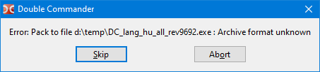 | Steps To Reproduce | select some files, invoke cm_PackFiles -> select "create self extracting archive" and chose either zip or 7z format (other formats I just didn't tried with), then start compression. Close to the finish, an error message appears. | ||||