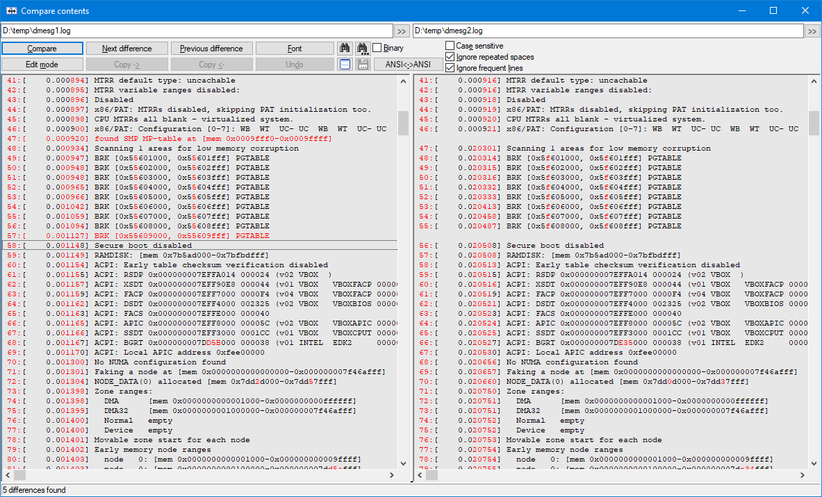 | Additional Information | Comparing logs with async events happening here and there - especially when it also contains timestamps, like kernel logs do - these kind of feature is a real life saver and can be extremely useful if one wants to continue analyzing THE REAL differences of two instances of such logs/traces.