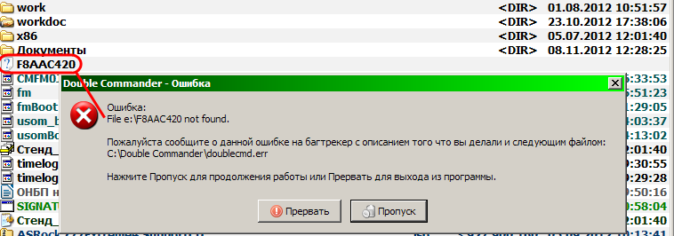I forgot to post DC error log: --------------- 13-11-2012, 15:35:41 --------------- | DC v0.5.5 alpha Rev. 5023M -- i386-Win32-win32/win64 | Windows XP SP3 i386 Unhandled exception: EFileNotFound: File e:\FE7FC420 not found. Stack trace: $006D7937 line 453, column 28 of filesources/filesystem/ufilesystemfilesource.pas in C:\Double Commander\doublecmd.exe $0070A2D1 line 355, column 11 of fileviews/uorderedfileview.pas in C:\Double Commander\doublecmd.exe $0064FF98 line 2757, column 9 of fileviews/ufileview.pas in C:\Double Commander\doublecmd.exe $00650125 line 2803, column 5 of fileviews/ufileview.pas in C:\Double Commander\doublecmd.exe $0064AD84 line 1022, column 46 of fileviews/ufileview.pas in C:\Double Commander\doublecmd.exe $00650993 line 2975, column 9 of fileviews/ufileview.pas in C:\Double Commander\doublecmd.exe $007059A7 line 770, column 49 of platform/ufilesystemwatcher.pas in C:\Double Commander\doublecmd.exe $0046CFBD in C:\Double Commander\doublecmd.exe $00506CC7 in C:\Double Commander\doublecmd.exe $7E368734 in C:\WINDOWS\system32\USER32.dll $7E368816 in C:\WINDOWS\system32\USER32.dll $7E3689CD in C:\WINDOWS\system32\USER32.dll $7E368A10 in C:\WINDOWS\system32\USER32.dll $0050BA15 in C:\Double Commander\doublecmd.exe $0043332C in C:\Double Commander\doublecmd.exe $0043374F in C:\Double Commander\doublecmd.exe $0045EC03 in C:\Double Commander\doublecmd.exe |