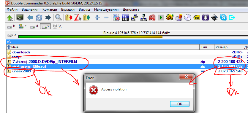 В архивы (ZIP) с превышением размера файла более 2Гб не входит. Выводит ошибку Access violation. |