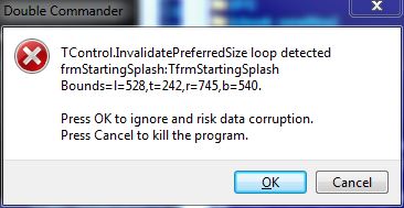 | Additional Information | --------------- 14-10-2013, 10:43:49 --------------- | DC v0.5.7 beta Rev. 5310M -- i386-Win32-win32/win64 | Windows 7 x86_64 Unhandled exception: Exception: TControl.InvalidatePreferredSize loop detected frmMain:TfrmMain Bounds=l=-32000,t=-32000,r=-31856,b=33525 Stack trace: $0055F7CA in B:\Portable Programs\Double Commander\doublecmd.exe $0055F6BB in B:\Portable Programs\Double Commander\doublecmd.exe $005544C7 in B:\Portable Programs\Double Commander\doublecmd.exe $00547F9B in B:\Portable Programs\Double Commander\doublecmd.exe $00553E02 in B:\Portable Programs\Double Commander\doublecmd.exe $0055F24E in B:\Portable Programs\Double Commander\doublecmd.exe $005469C5 in B:\Portable Programs\Double Commander\doublecmd.exe $005461C9 in B:\Portable Programs\Double Commander\doublecmd.exe $00545CFB in B:\Portable Programs\Double Commander\doublecmd.exe $0042540A in B:\Portable Programs\Double Commander\doublecmd.exe $0054D0E1 in B:\Portable Programs\Double Commander\doublecmd.exe $005588C3 in B:\Portable Programs\Double Commander\doublecmd.exe $00558672 in B:\Portable Programs\Double Commander\doublecmd.exe $00547790 in B:\Portable Programs\Double Commander\doublecmd.exe $0055F94E in B:\Portable Programs\Double Commander\doublecmd.exe $00551A05 in B:\Portable Programs\Double Commander\doublecmd.exe $0054E0F5 in B:\Portable Programs\Double Commander\doublecmd.exe | ||||
