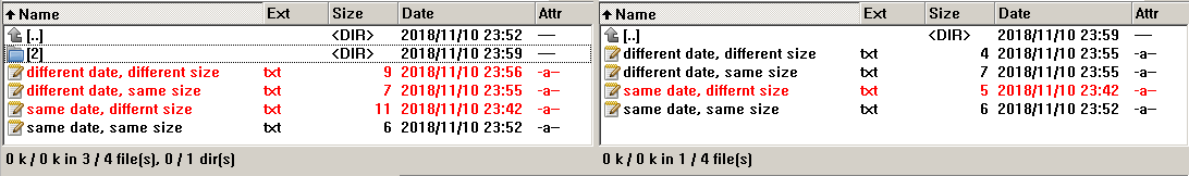 Maybe I misunderstood, but I tested the menu "Mark/Compare directories" (see 1st screen shot). The issue is with the 3rd file in the screen shot, which is NOT marked at any side. (I am using DC v.0.8.4 under Ubuntu LTS 18.04) If the dates are different, then the file size indeed should be ignored. But if the date+time are exactly the same, then the file size should be compared as well and if the sizes are different then both sides should be marked. TC 9.12 under Wine does exactly that (see 2nd screen shot). As that would change established behavior of DC that probably needs an extra option under "Behaviors"? E.g. "Mark/Compare Directories: identical Date/Time compares file size too" (I cannot think of a shorter option name :-) |
